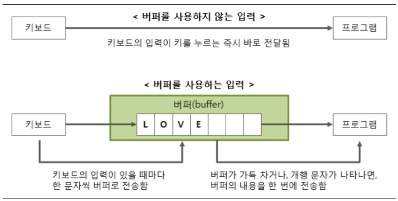 - 반면! 버퍼를 사용하는 입력은, 키보드의 입력이 있을 때마다 한 문자씩 버퍼로 전송된다.