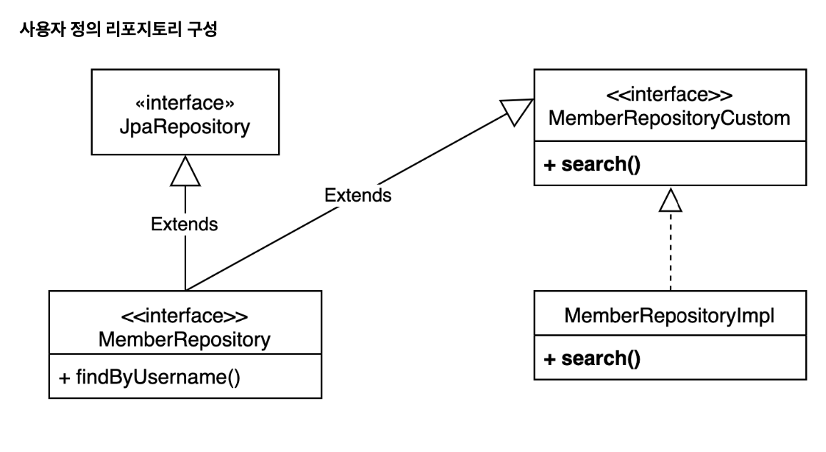 - Querydsl 전용 기능인 회원 search를 작성할 수 없다. -> 사용자 정의 리포지토리 필요