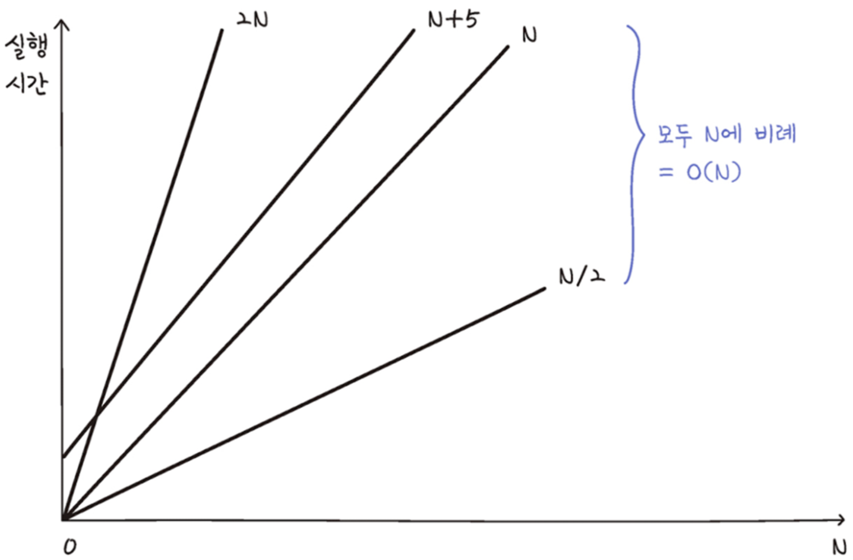 시간 복잡도는 정확한 실행 시간을 계산하는 용도가 아닙니다. 단지 실행 시간이 어떤 요인으로 결정되는지 나타내는 수식일뿐입니다. 따라서 시간 복잡도에서는 곱하거나 더해지는 상수 부분은 나타내지 않습니다.
