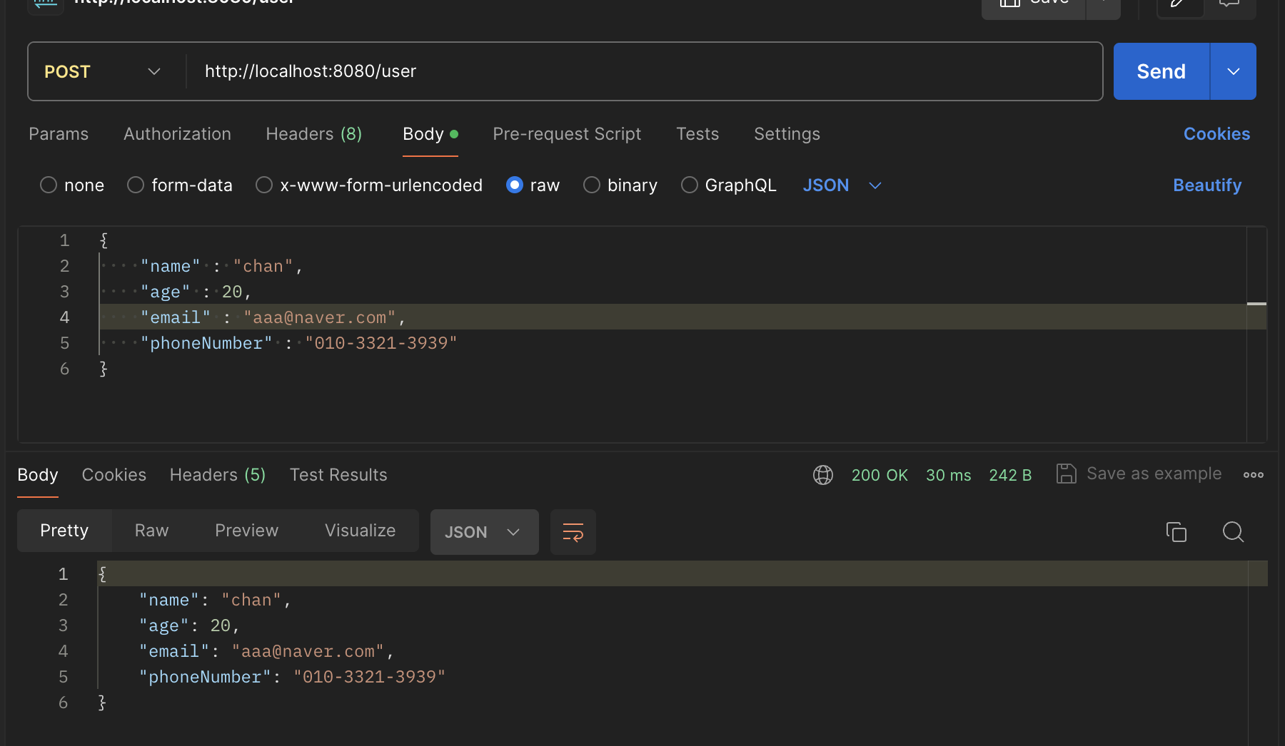 UserRequest에 검증 어노테이션을 붙인다고 검증이 적용되는 것은 아니다. 해당 어노테이션을 활성화려면 해당 DTO를 사용하는 컨트롤러 메서드의 매개변수 앞에 @Valid를 붙여줘야 한다.