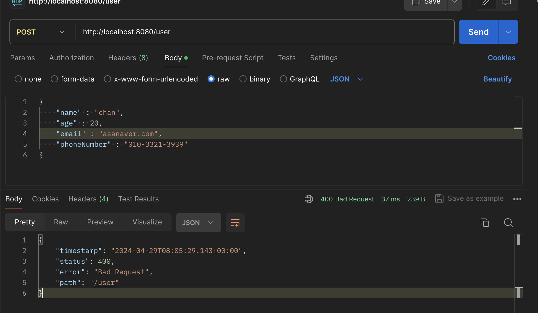 UserRequest에 검증 어노테이션을 붙인다고 검증이 적용되는 것은 아니다. 해당 어노테이션을 활성화려면 해당 DTO를 사용하는 컨트롤러 메서드의 매개변수 앞에 @Valid를 붙여줘야 한다.