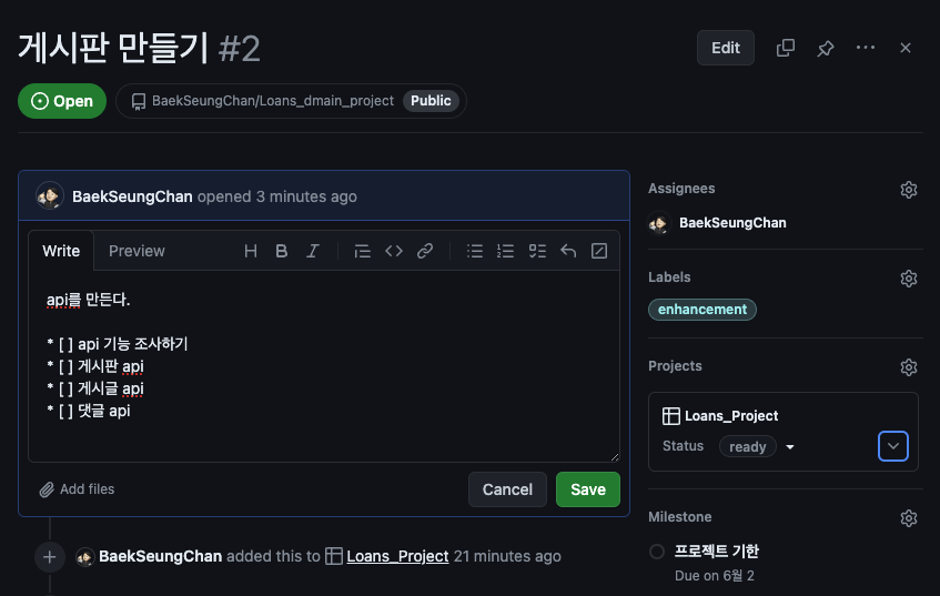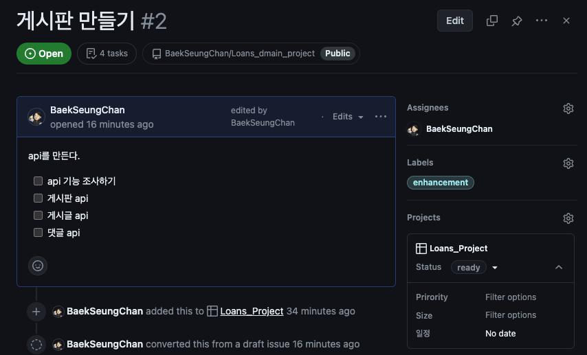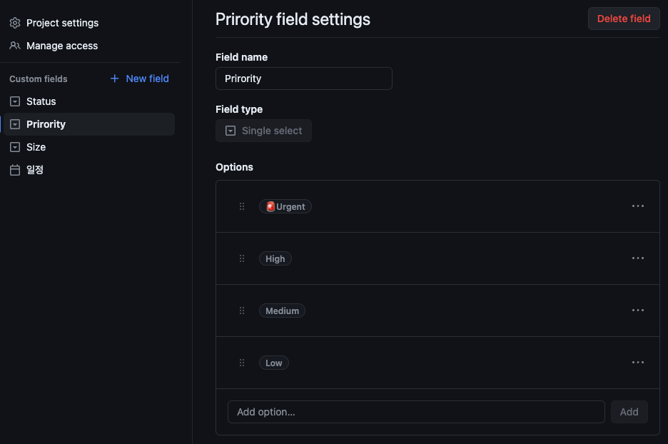 - 프로젝트에 생성한 Item setting을 통해 이슈 생성 및 설정