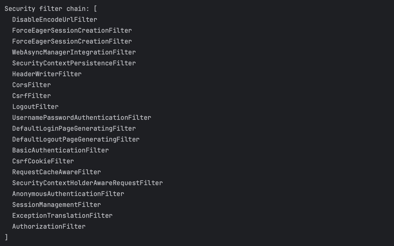 - 설정을 완료하고 애플리케이션을 디버그 모드로 실행하면, Spring Security 프레임워크가 활성화된 모든 내부 필터를 확인할 수 있습니다.