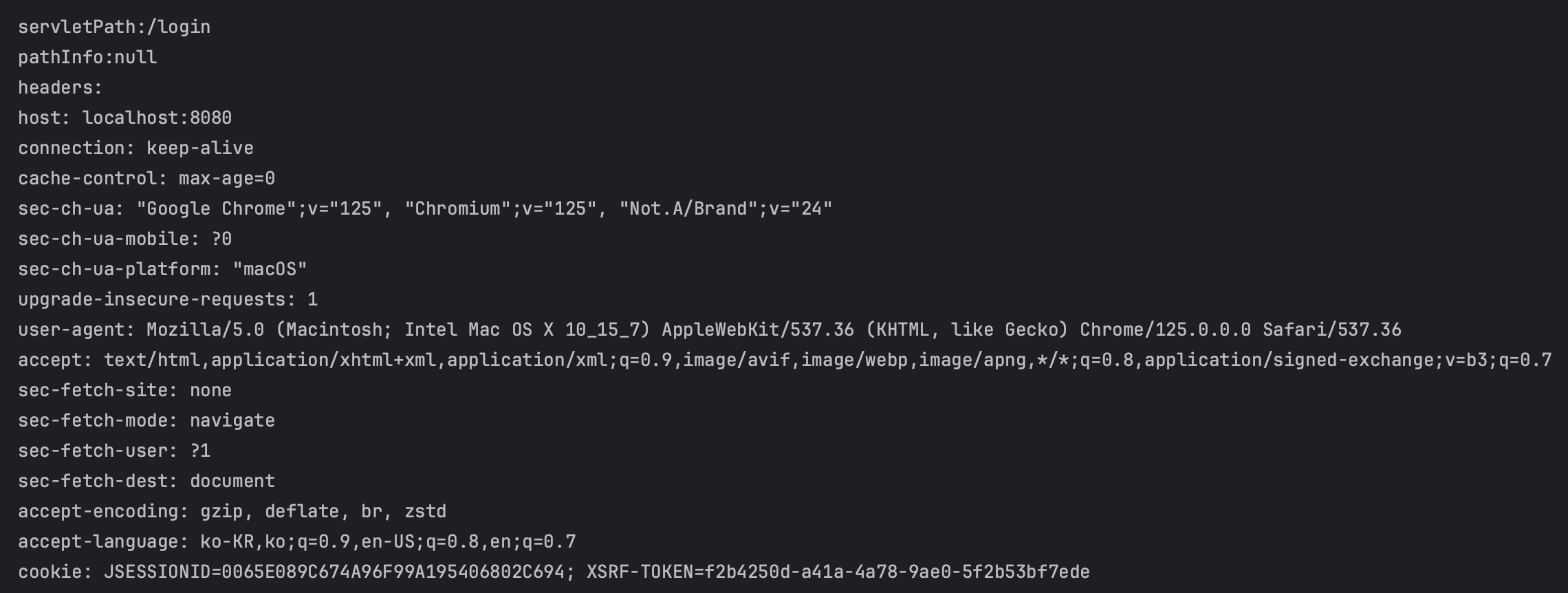 - cookie: 클라이언트의 쿠키 정보 (예: JSESSIONID, XSRF-TOKEN)