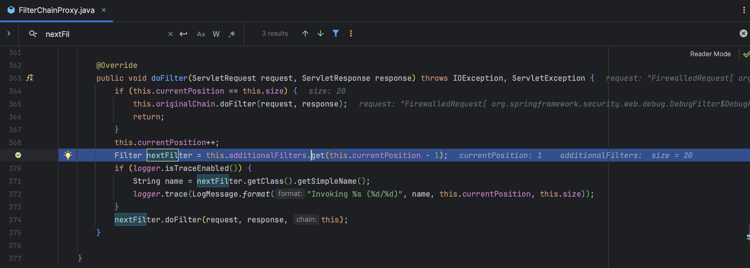 - 필터 체인의 각 필터를 하나씩 확인하고, 각 필터의 역할과 동작을 이해할 수 있습니다.