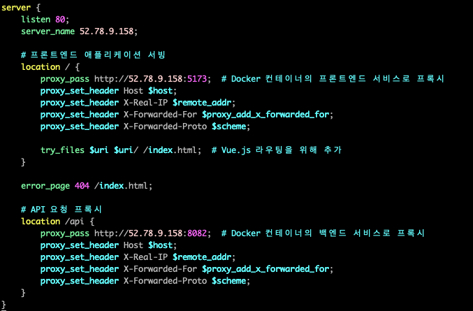 proxy_pass http://52.78.9.158:8082; # Docker 컨테이너의 백엔드 서비스로 프록시
