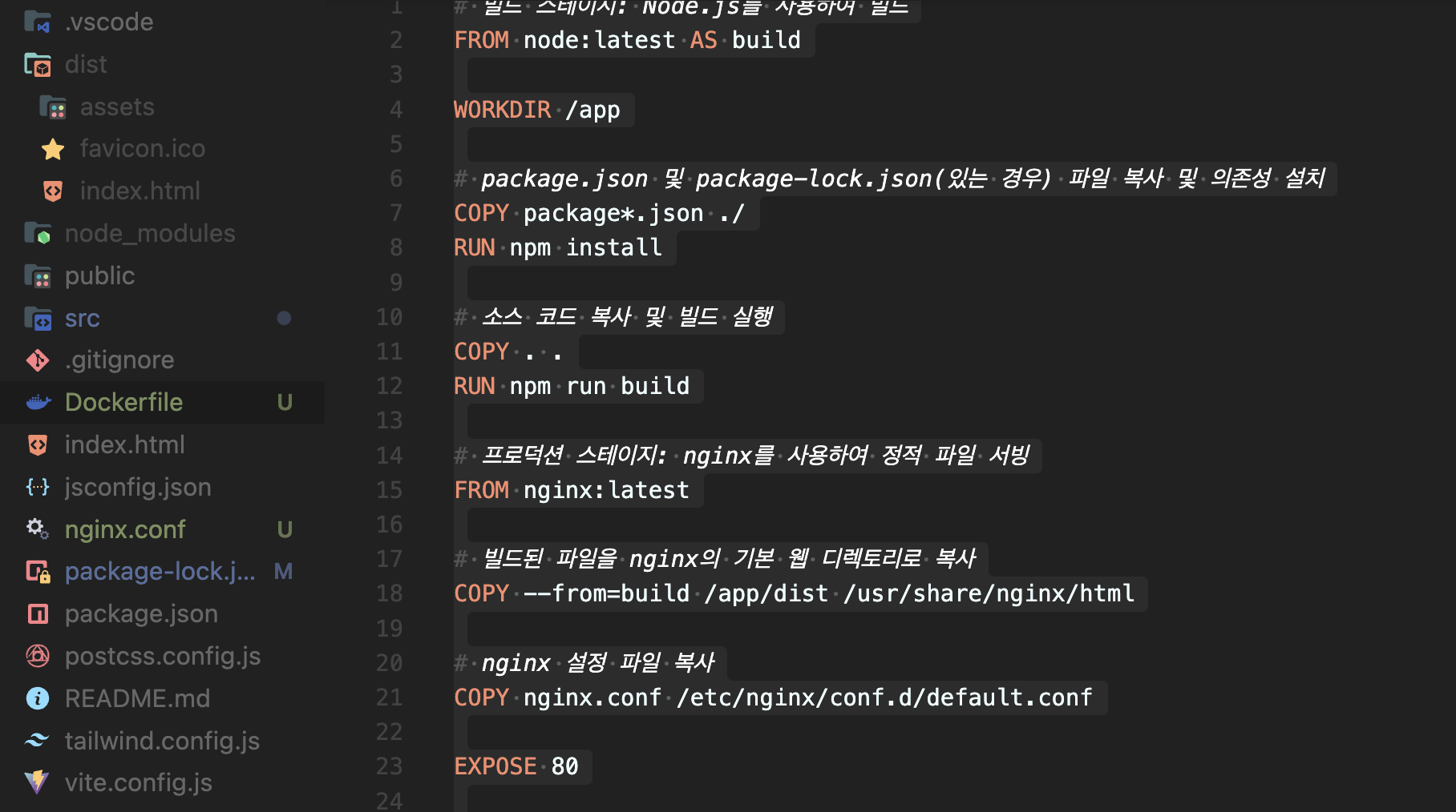 이 Dockerfile은 Node.js를 사용하여 애플리케이션을 빌드하고, nginx를 사용하여 정적 파일을 서빙하는 환경을 설정합니다. 빌드 스테이지에서 애플리케이션을 빌드한 후, 프로덕션 스테이지에서 nginx를 사용하여 정적 파일을 제공하게 됩니다.